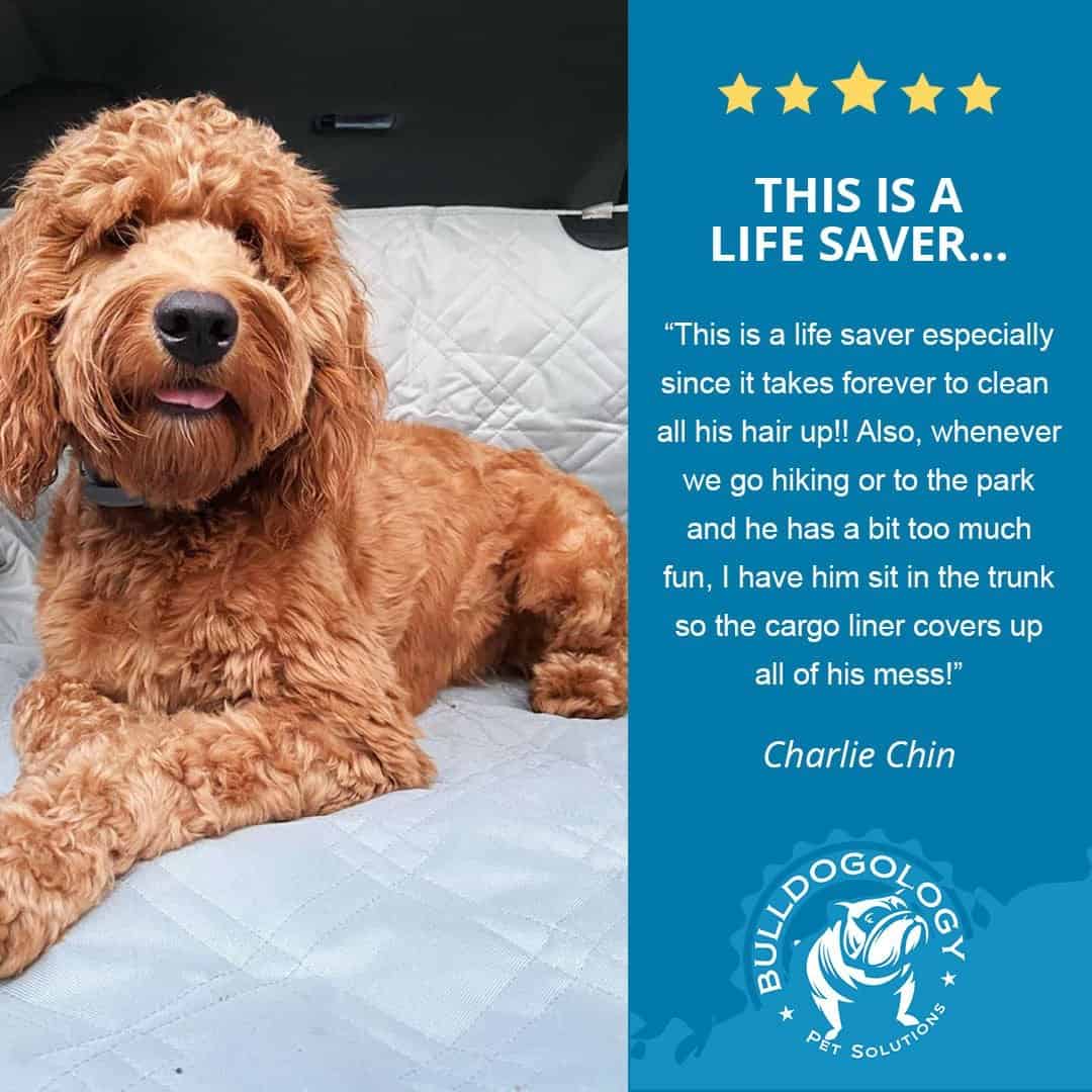 “Has held up to drool, mud, etc. it fits my 2002 Highlander perfectly. Stays in place well by attaching to the head rests. Has extra length to protect the car bumper when I want, but also stays folded under when I don’t want the length. Love that it is washable. Thrilled and my lab is happy too.” – BJH