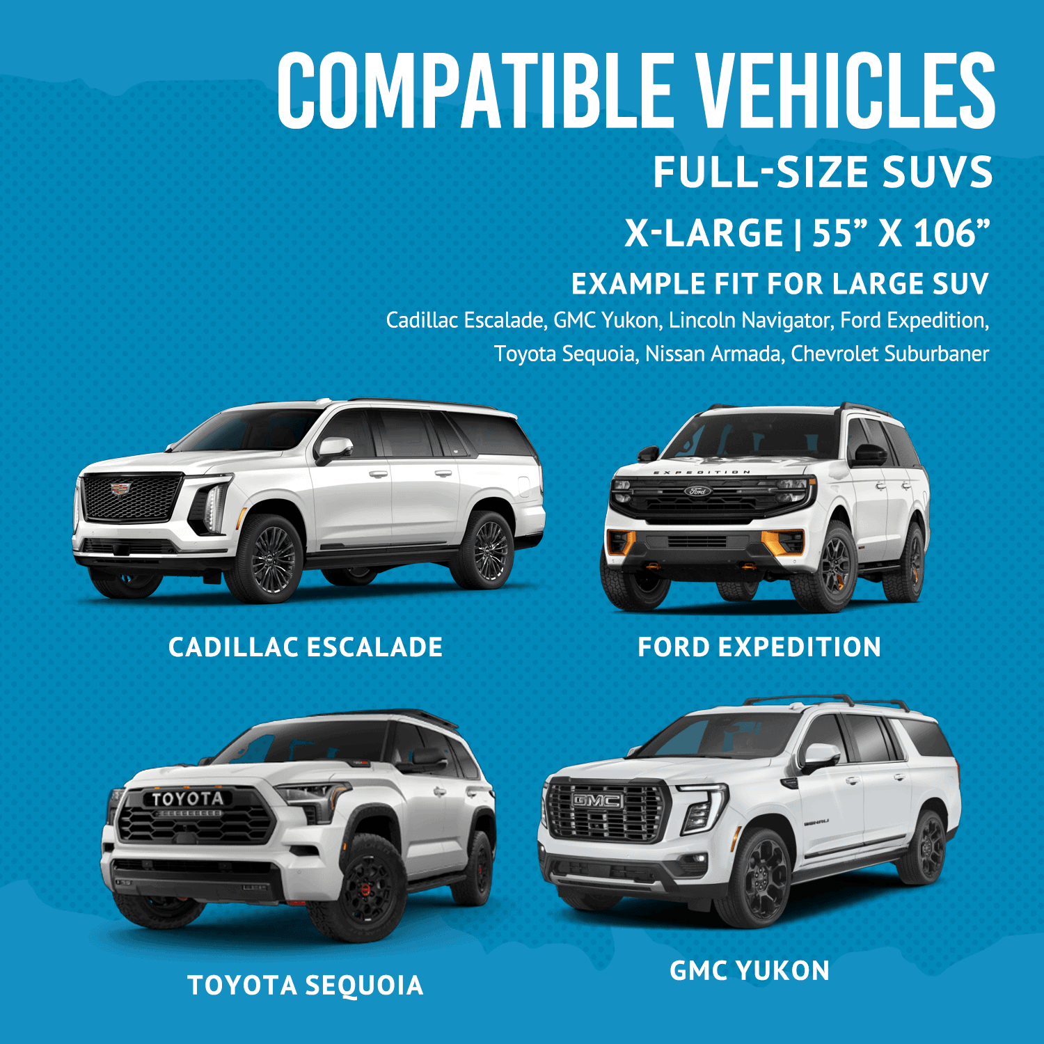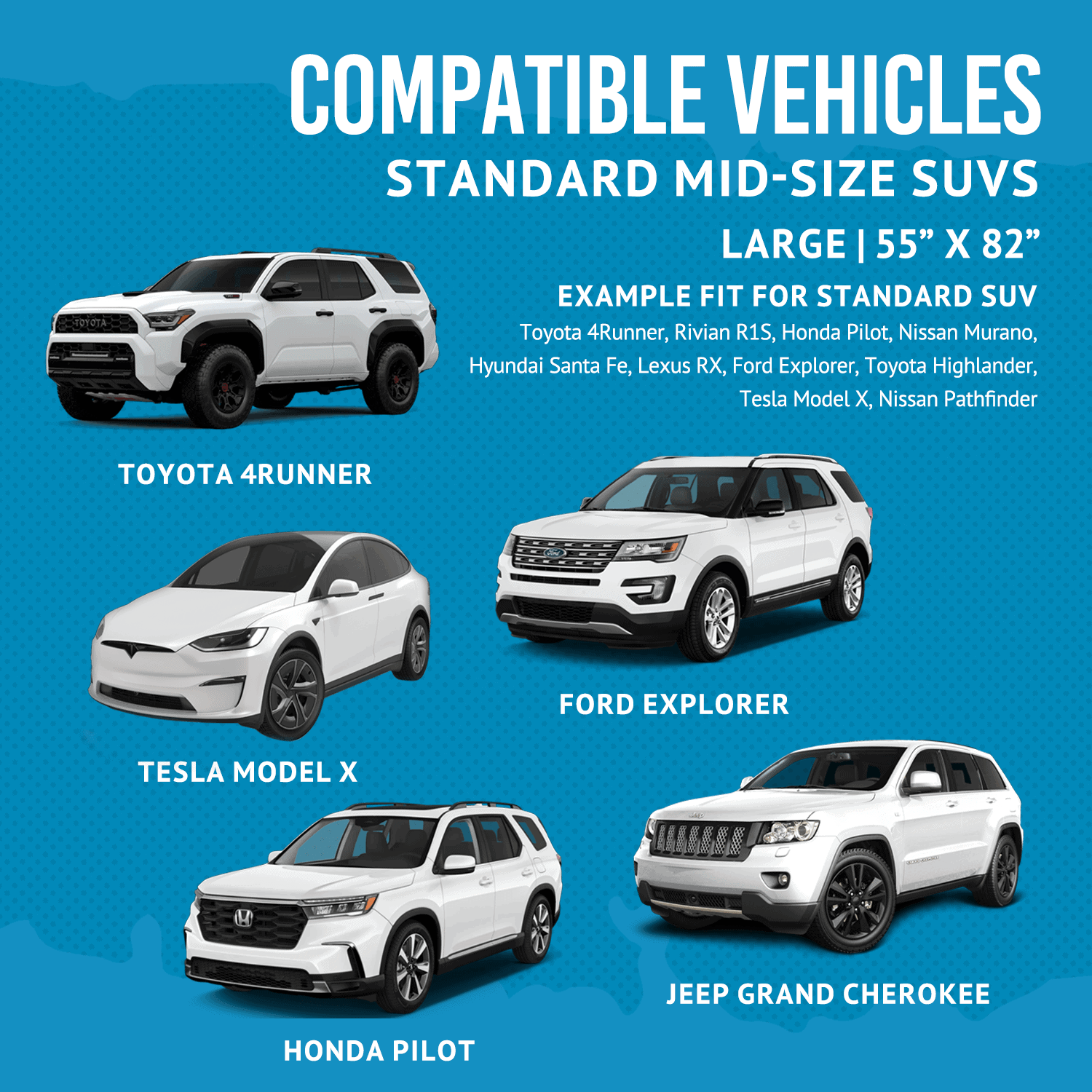 - Available Size: 55″ W x 82″ L (Large) or 55″ W x 106″ L (X-Large)