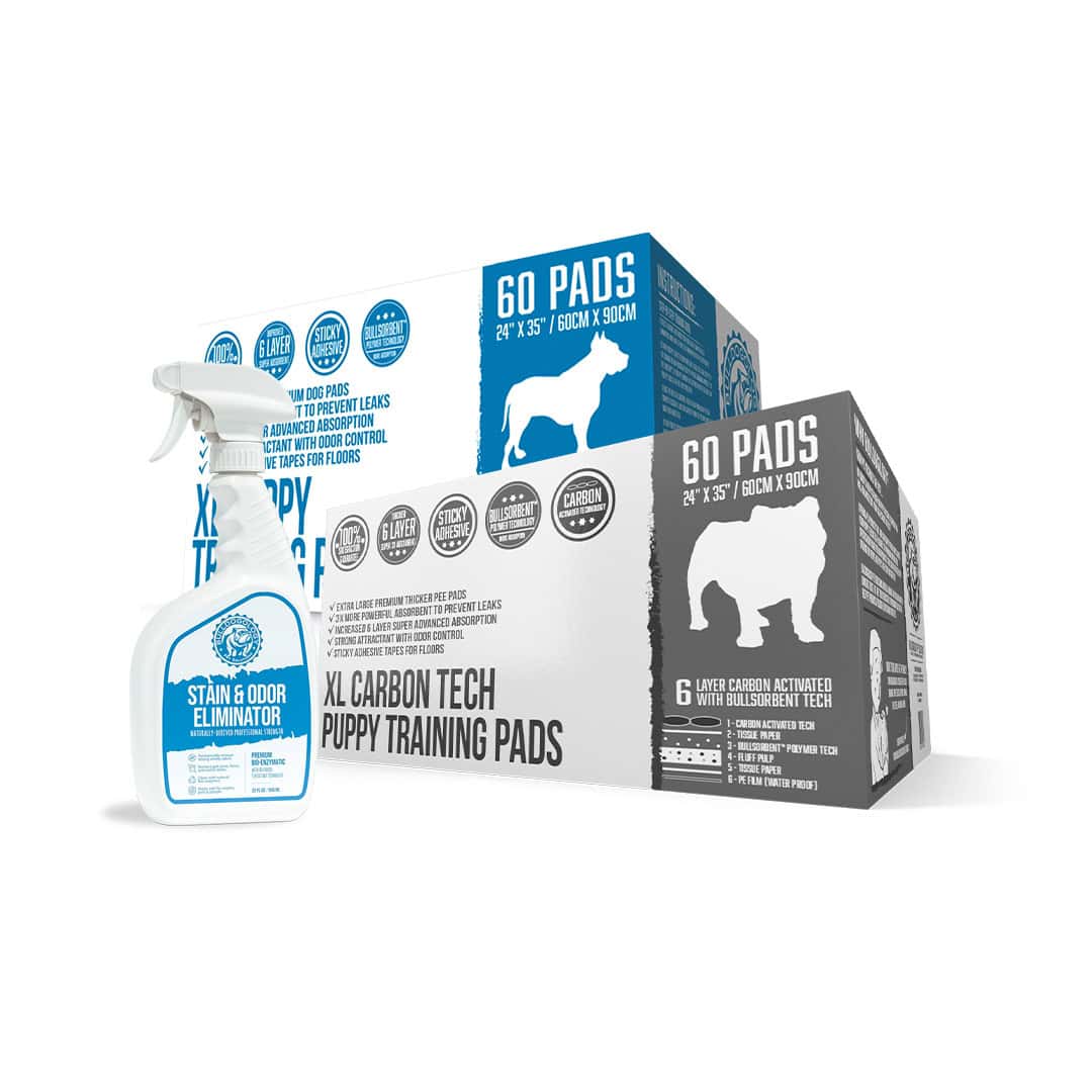 - 1x 60 Count Large 24×35 Puppy Pee Pads with new Bullsorbent Polymer Tech that instantly absorbs fast and turns liquid into gel, keeping floors, tiles, or carpets quickly dry
