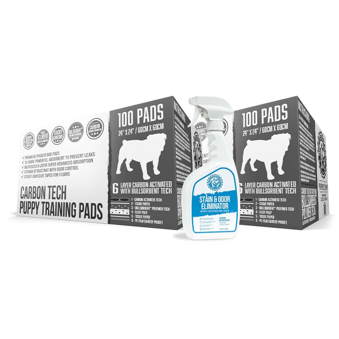 This bundle comes with 2x 100 count boxes of carbon activated absorbent pee pads (24×24″) plus our own Bullsorbent® polymer that instantly absorbs fast and turns liquid into gel, keeping floors and carpets quickly dry, plus Bulldogology pet stain & odor powerful natural enzymatic 32 oz. spray with advanced surfactant technology to activate and combine a deep cleaning formula that removes stains and odors from carpet, rug, pet bed, furniture, hardwood, clothing, kennel, litter box, and all other areas where stains occur.