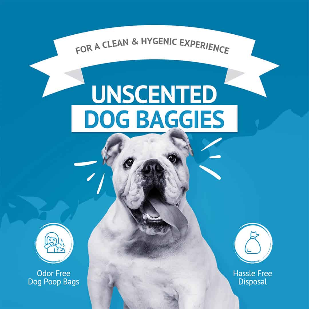• UNSCENTED DOG BAGGIES: The only thing worse than the smell of dog poop is the attempt to mask that smell with strong perfumes and scents, which is why our odorless doggy poop bags seal in the smell with no added aromas. Just grab your dog’s business in a dog waste bag and toss it out, no extra steps.
